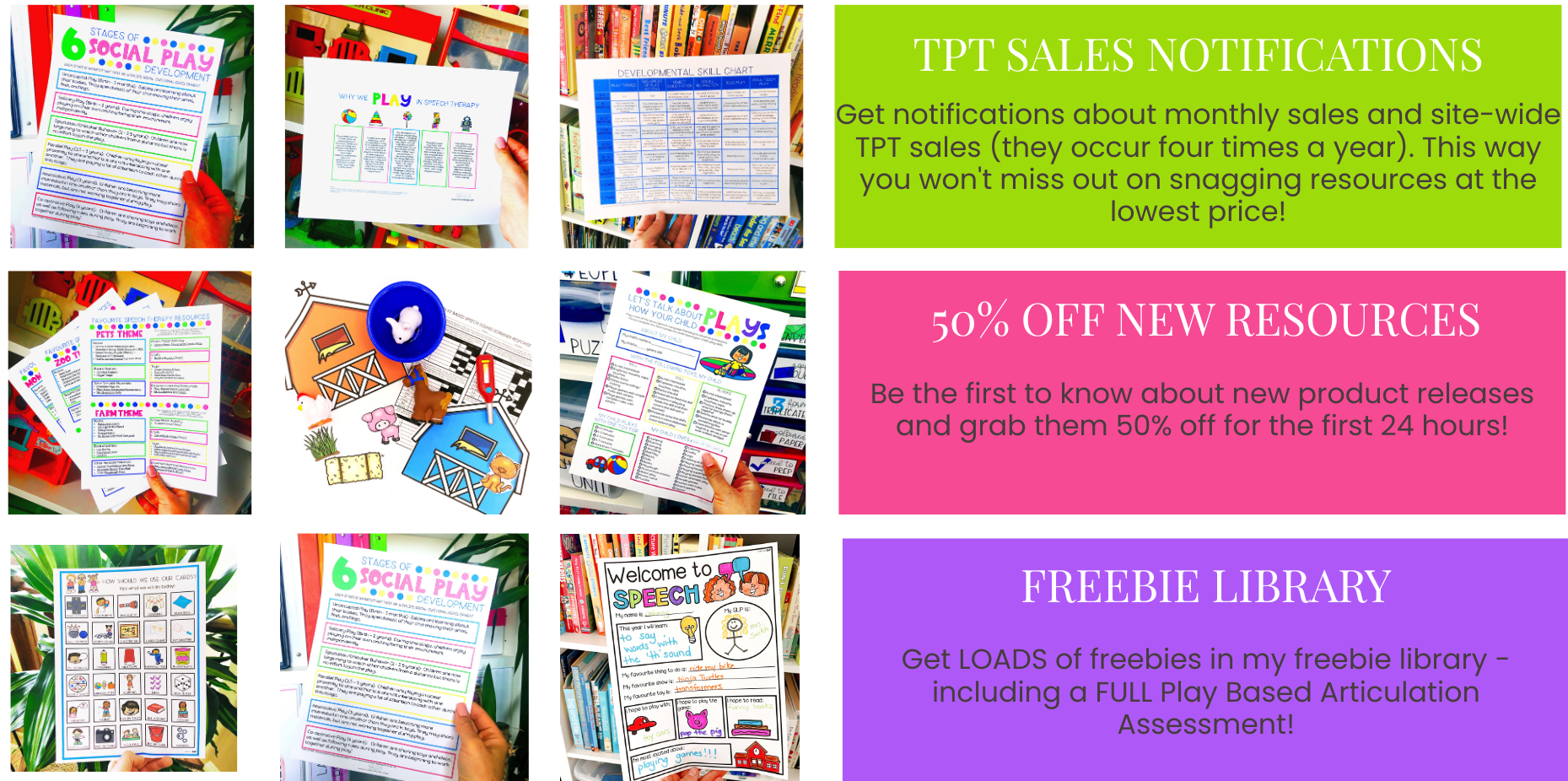 Sign up for my Freebie Library filled with play-based preschool speech therapy handouts, SLP resource lists, and ready-to-use therapy activities you can download instantly. Perfect for busy speech-language pathologists looking to save time and engage students.